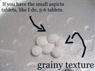 1) Take about 2-3 tablets of aspirin. If you have the small kind like I do, use 5-6.2) Sprinkle water on the tablets ... and I do mean sprinkle! If you use too much water, then they will become too mushy and pretty much useless.
