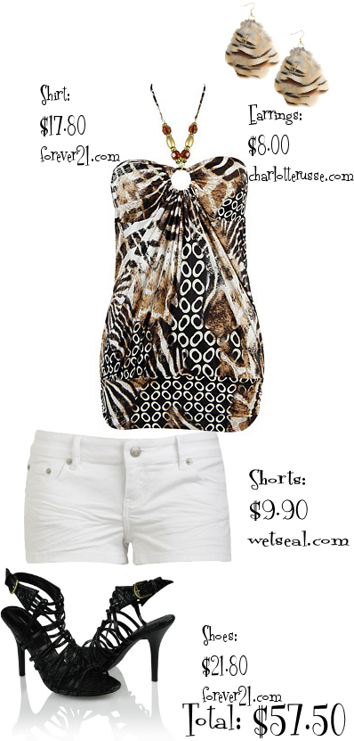 Okay, this is, like, my favorite outfit ever because I love dressing up. It's something you'd wear when you need to be dressy, but not too dressy. If this is a little too sexy for you, try substituting white jeans for the shorts, and putting a black cropped cardigan over the top! I would suggest wearing your hair down with this outfit; maybe wavy or curly.
