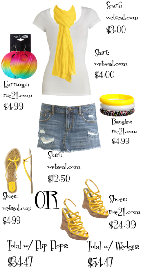 This is a dress down outfit for shopping or hanging out with friends, so you can be comfy and stylish! The yellow scarf dresses up the plain white t-shirt, and the colorful earrings make the outfit pop. If you want to really make it dressy, wear the wedges instead of the flip-flops. Or, if you want to dress it down, wear shorts or jeans instead of a skirt.