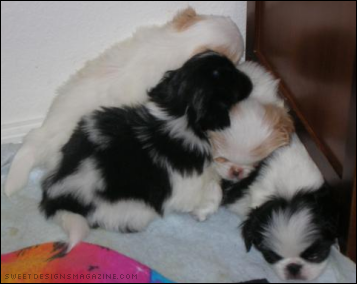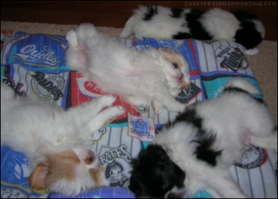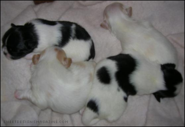 In December 2007 my momma dog Geisha, a Japanese Chin, gave birth to 4 puppies. The Japanese Chin is an uncommon breed of small dog. Their litters normally consist of 1 or 2 puppies. For my dog, having 4 puppies was incredible. There is rarely as big of a litter as 4, or even 2. My mom was at work and had been there for a few hours. Around 8 am, Geisha went into labor. I was 14 at the time, and had no clue what was going on or what to do. I immediately got on the phone with my mother, who rushed home just in time for the first puppy, Charlie, to be born. Geisha's natural instinct kicked in and she began taking care of her first baby. While attending to her pup, Samurai, the daddy, was anxiously prancing around, freaking out, and not knowing what to do at all.
